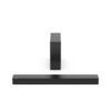 The Hisense HS3100 Soundbar features a clean and minimalistic design with smooth edges and a matte black finish that allows it to blend seamlessly into various living room aesthetics. The soundbar has a slim and elongated profile that fits easily under most TVs without blocking the screen or interfering with remote signals. It is constructed with durable materials that provide a premium feel. The wireless subwoofer is housed in a solid rectangular cabinet that complements the soundbar both visually and acoustically. Its non-intrusive design makes it suitable for placement in multiple locations around the room.